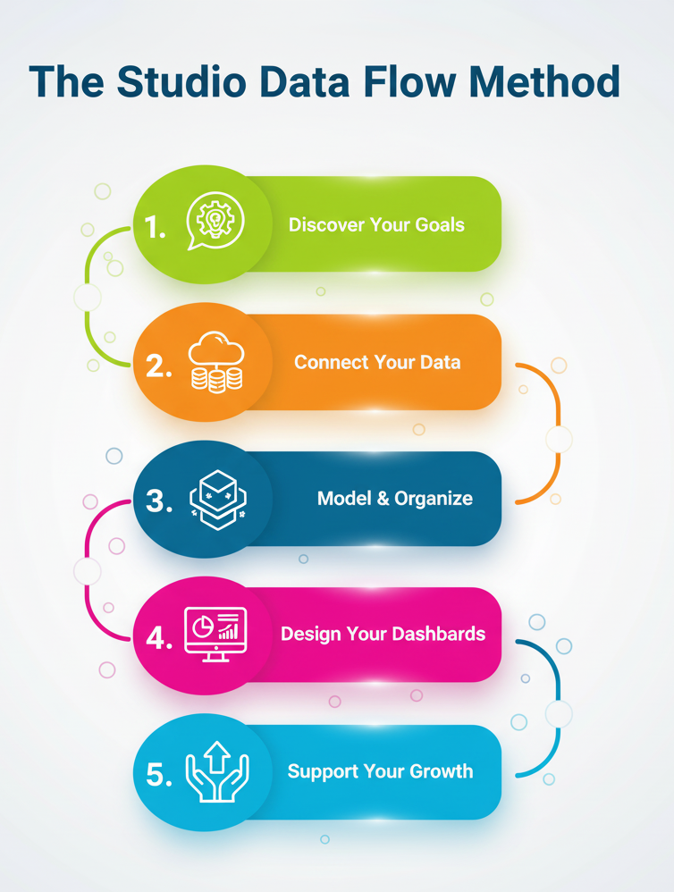 At Studio Data Flow, we combine strategy, technology, and design to turn raw data into meaningful insights. Our streamlined process transforms complexity into clarity, helping your business innovate, grow, and make smarter decisions with confidence.